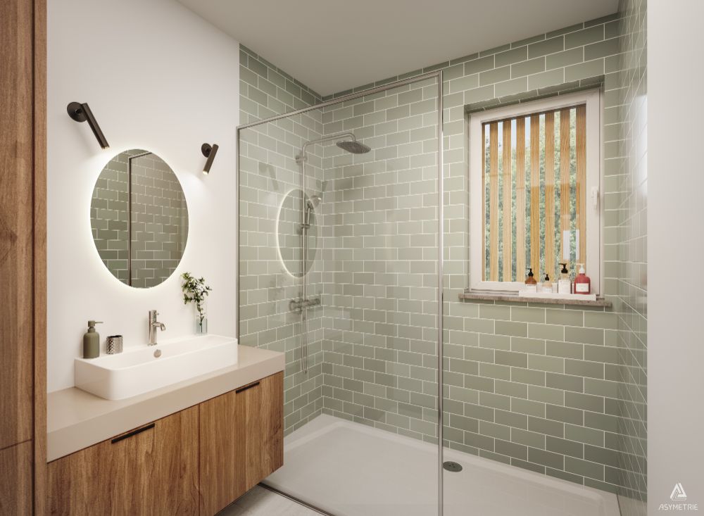 Structure ossature bois – isolation biosourcée / Bardage extérieur bois naturel ajouré / Châssis haute performance extérieur - aluminium noir et intérieur – PVC / Chauffage sol avec pompe à chaleur / Ventilation double flux / Toiture végétale / Parquet visuel chêne, isolation en liège pour acoustique / Cuisine hyper équipée (four, lave-vaisselle, frigo,…) / Salle de bain avec douche italienne / Terrasse en bois / Abris / rangement vélo